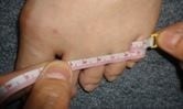 1、各趾の太さを計測(※メジャーを趾裏のくぼみにあてて計測してください。(メジャーは写真のように8ミリ幅タイプですと測りやすいです)。